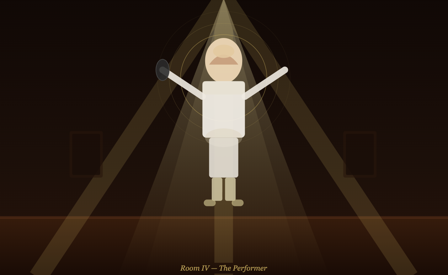 IV — The Performer — a white-suited figure center-stage, arms raised, microphone in hand, ringed by golden halo circles and dramatic light rays.