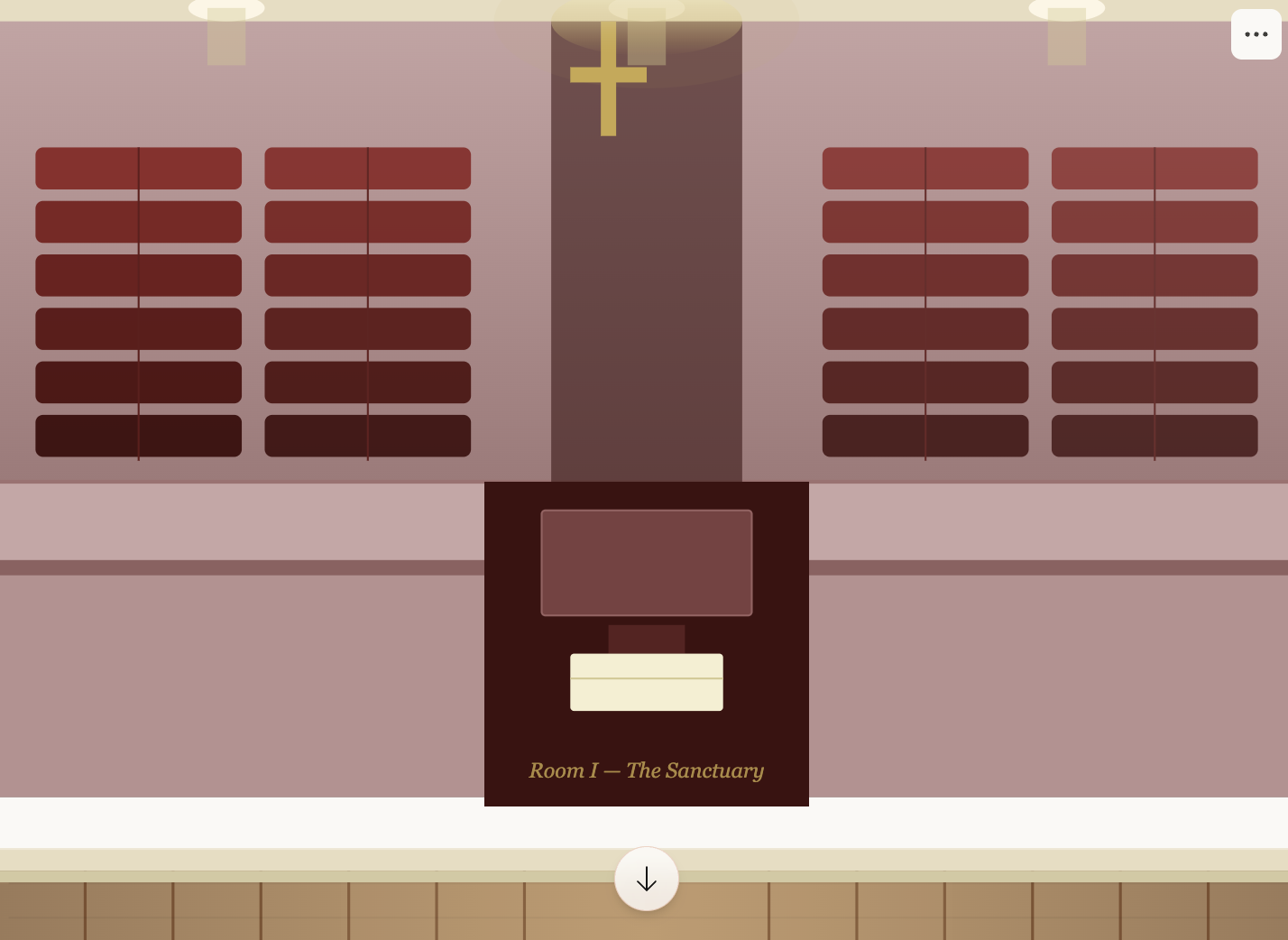 I — The Sanctuary — lavender-rose pews receding toward a gold cross, altar cloth and Bibles at the front.
