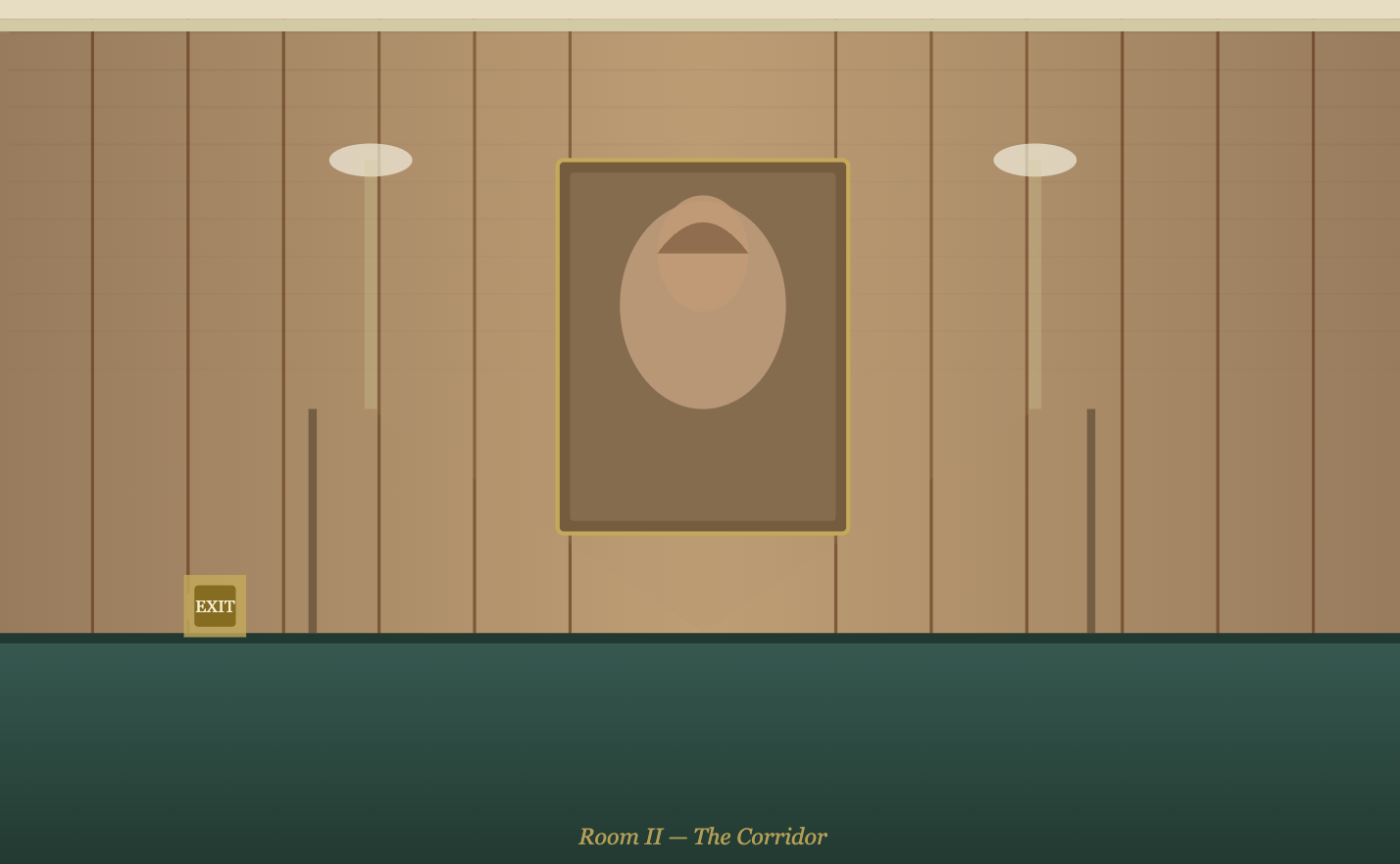 II — The Corridor — deep wood-panel perspective with teal carpet floor, ceiling tile strip lights, and a framed portrait of Christ at the vanishing point.