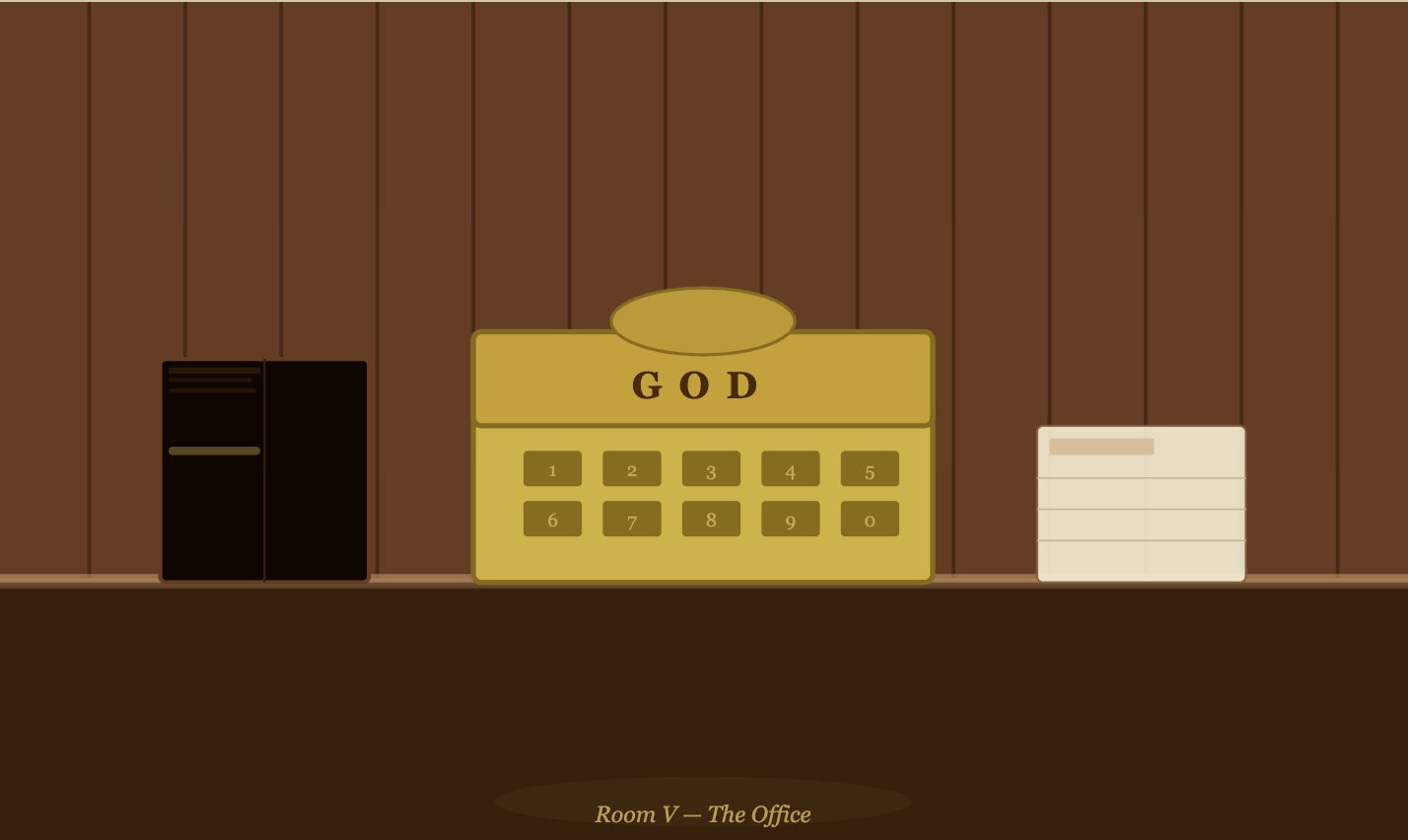 V — The Office — the golden "GOD" telephone on a wood-paneled wall above a desk, pushbutton keys, a King James Bible alongside a notepad.