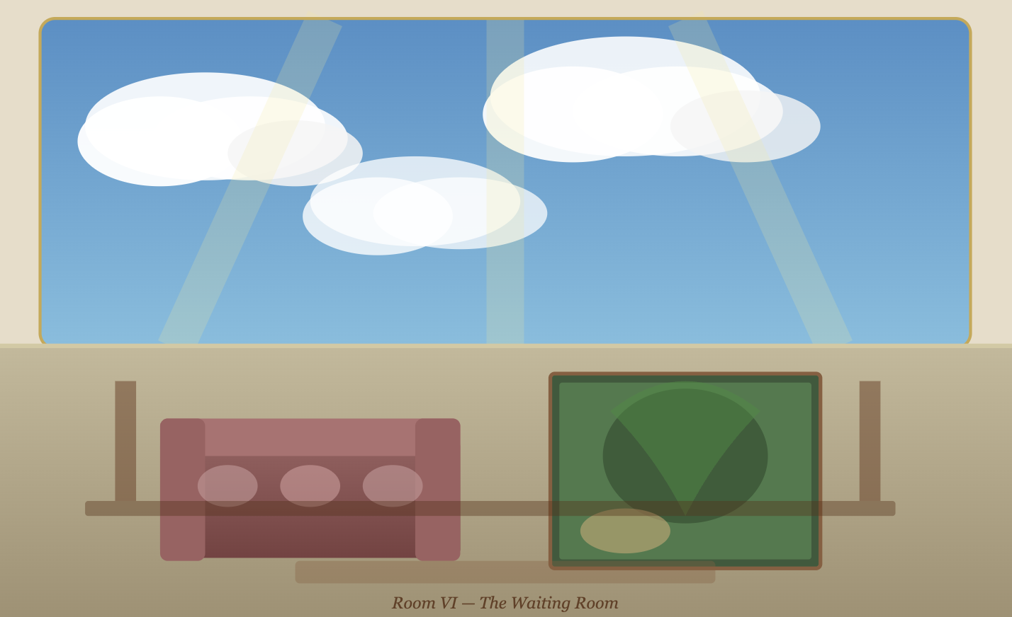 VI — The Waiting Room — a hand-painted sky ceiling with cumulus clouds and light rays, floral couch below, a landscape painting on the adjacent wall.