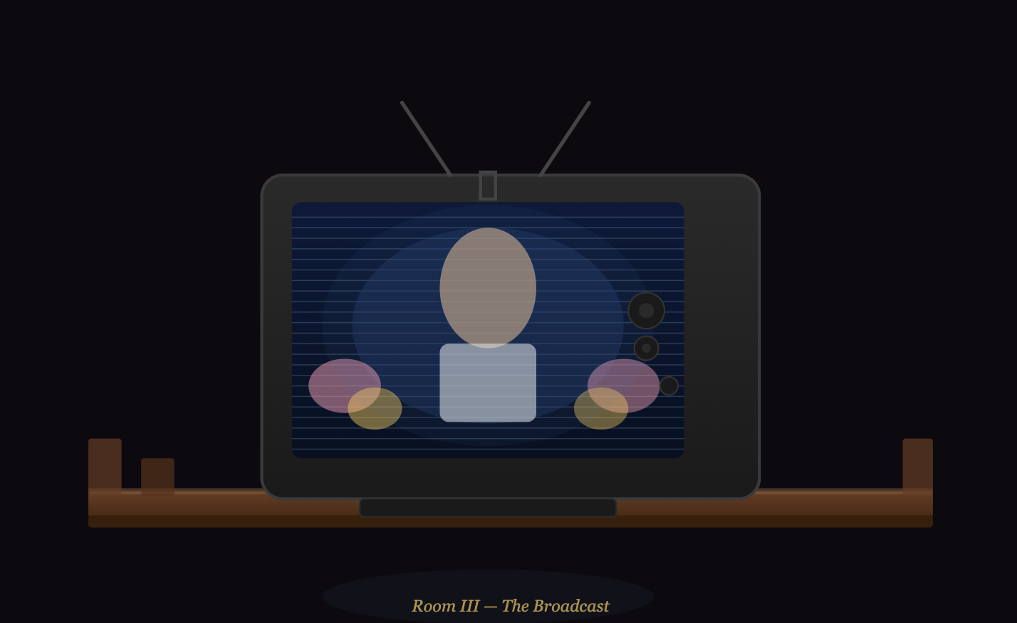 III — The Broadcast — a CRT television on a wood shelf, scanlines over the presenter's figure, flowers flanking her, screen glow bleeding into a dark room.