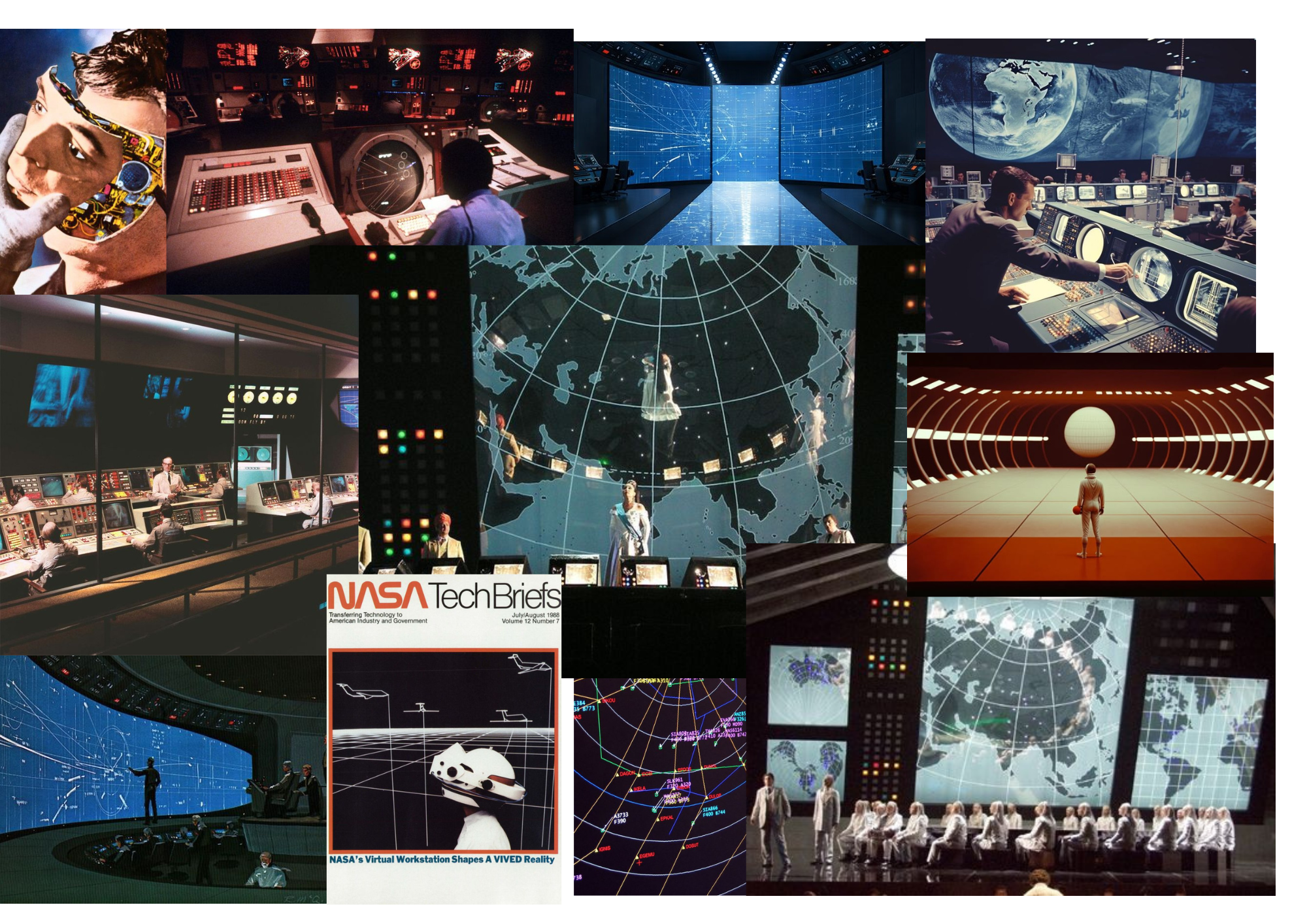Reference: NASA ground control rooms of the 1960s–80s, Cold War tracking stations, NORAD surveillance bunkers and speculative command centres of mid-century science fiction.