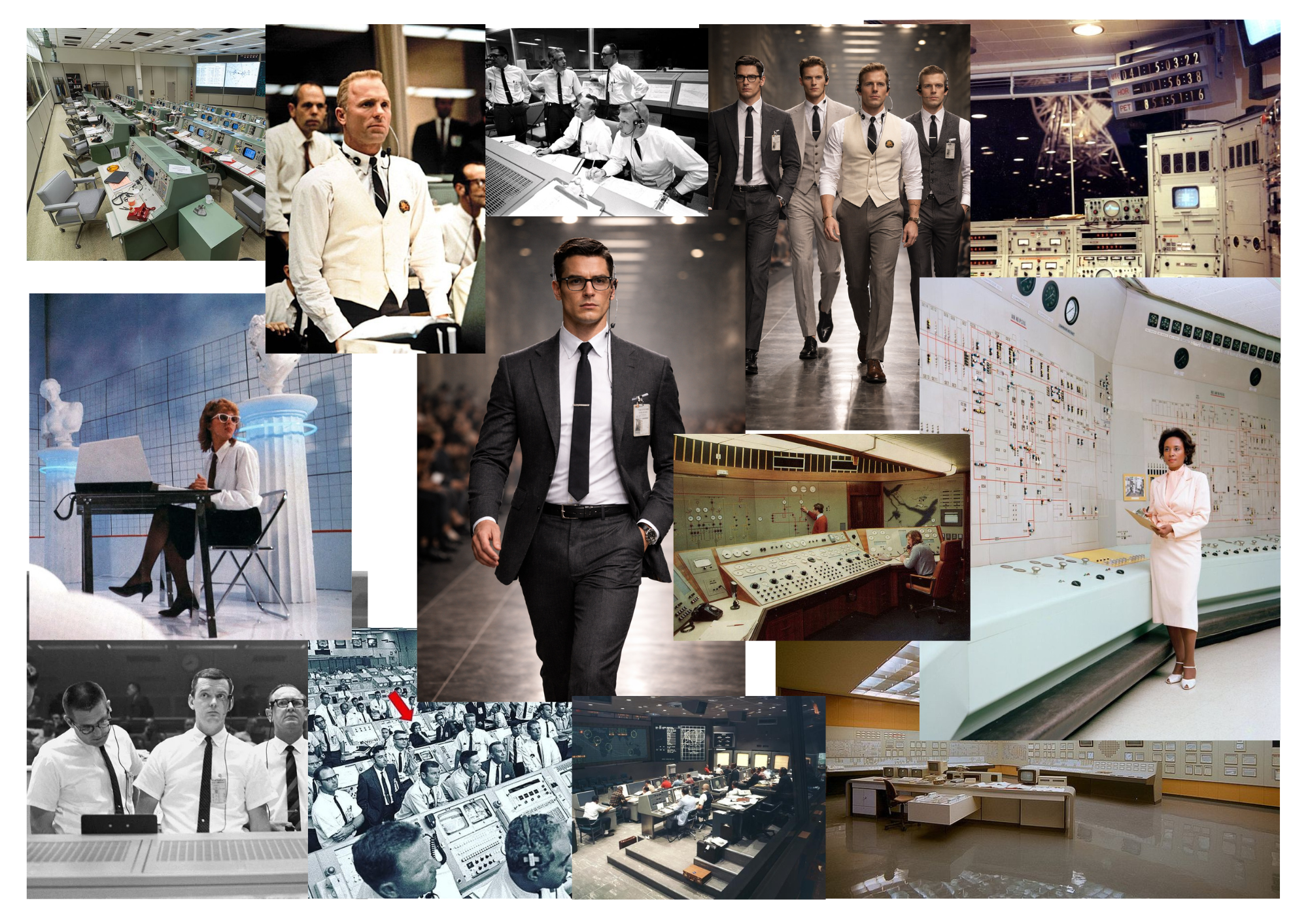 Mirrors the collection: structured suits, sharp lines, authority silhouettes
