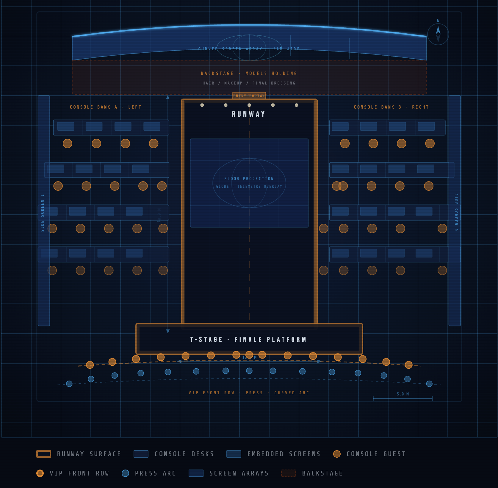 Cool overhead lighting, spotlights on models